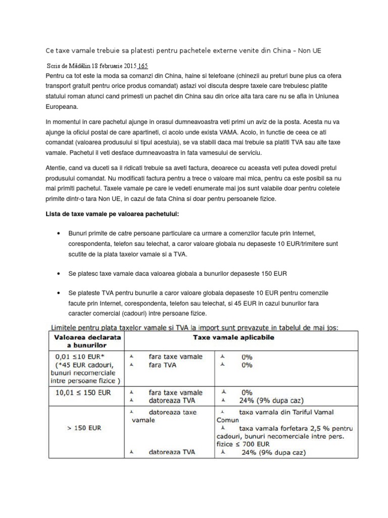 Impozitele cum ar fi tva sau taxe vamale nu sunt incluse în determinarea dpv. Dacă ați comandat sau vrei să cumpărați ceva de pe un site precum gearbest sau aliexpress pentru un produs cu preț 100 începând cu 2017 veți plăti tva 19 din valoarea acestuia. China a suspendat taxele vamale suplimentare asupra produselor americane taxe ce urmau să intre în vigoare duminică după anunţul făcut vineri de beijing şi washington privind încheierea unui armistiţiu în războiul lor comercial informează agerpres. Taxe vamale import china pentru persoanele fizice.