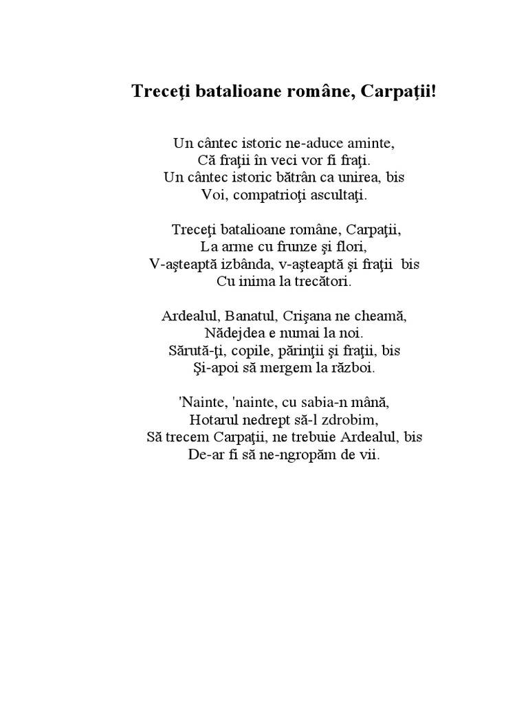 Treceți batalioane române carpații versuri. Cântecul a fost scris probabil în timpul primului. Treceți batalioane române carpații la arme cu frunze și flori v așteaptă izbânda v așteaptă și frații cu inima la trecători. Preasfințitul părinte damaschin dorneanul doctor în teologie al facultății sfântul andrei şaguna din sibiu.