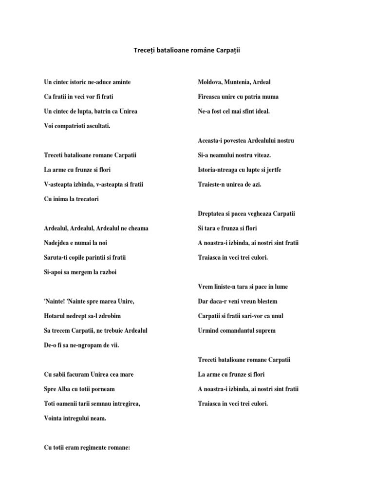 Please note that this blog has now been transferred to the new créativité blog here hope to see you over there. Treceti batalioane romane carpatii la arme cu frunze si flori v asteapta izbinda v asteapta si fratii cu inima la trecatori ardealul ardealul ardealul ne cheama nadejdea e numai la noi saruta ti copile parintii si fratii si apoi sa mergem la razboi nainte. Nainte spre marea unire hotarul nedrept sa l zdrobim sa trecem carpatii ne trebuie. Rondo în re major pentru pian i orchestrş ă kv 382 cristoph adt 10 03 3.