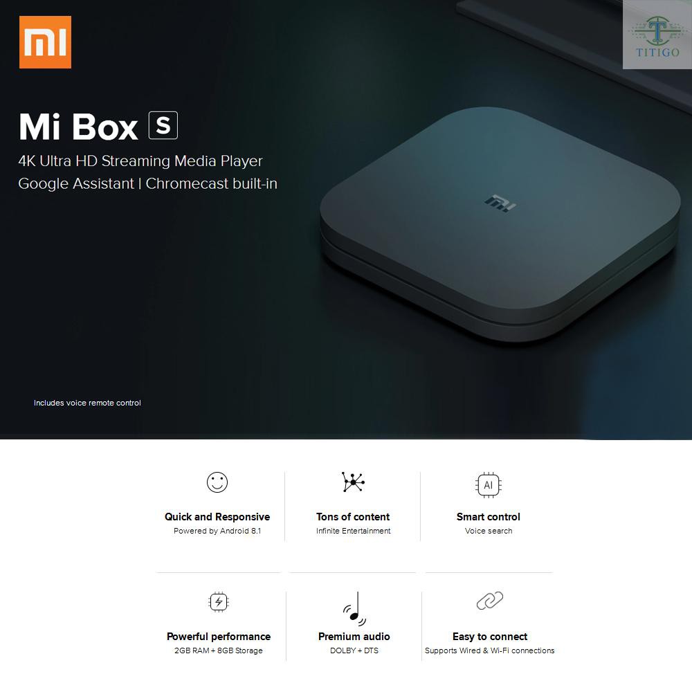 The mi box s is a 4k ultra hd streaming media player powered by android tv for superior functionality and improved ease of use. It supports google assistant and chromecast ultra as well as delivering a world of content the whole family can enjoy. Xiaomi mi box s 4k android tv box media player hdr dolby dts chromecast. Google assistant chromecast built in powered by android 8 1 for superior functionality.